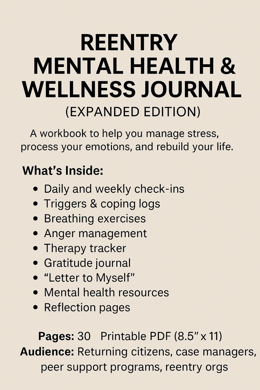 Reentry Mental Health & Wellness Journal (30-Page Printable Recovery Workbook)