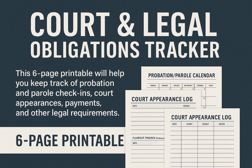 Avoid costly mistakes and stay on track during reentry with this printable 6-page legal tracker. Whether you're managing parole check-ins, community service, or court dates — this kit is built to keep you focused and organized.